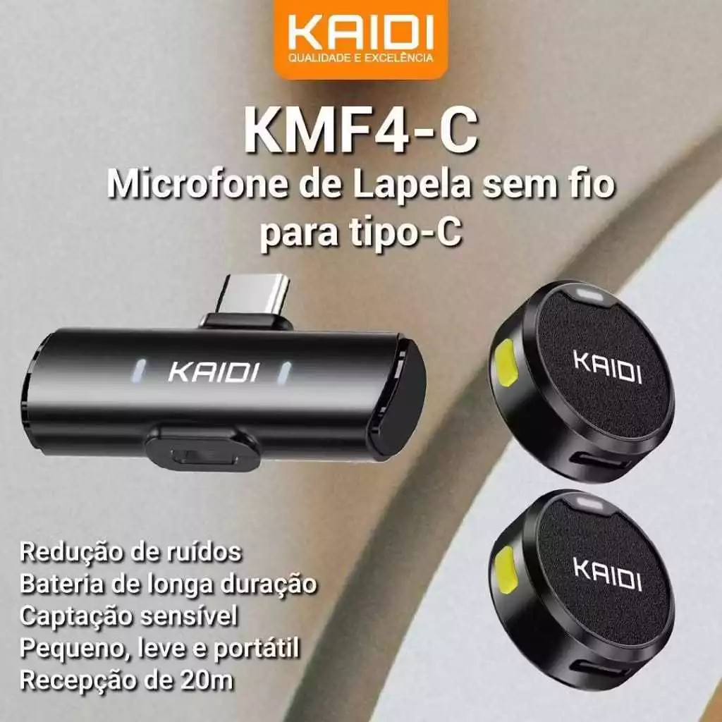 O Kaidi KMF4-C (ou KMF6) é um conjunto de microfones de lapela sem fio que oferece praticidade e áudio claro para gravações externas, ideal para vlogs, entrevistas, aulas e transmissões ao vivo.