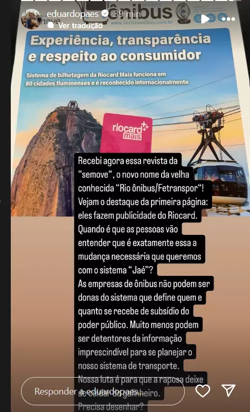Eduardo Paes critica RioCard e empresas de ônibus e recebe uma chuva de críticas no Instagram cami, 31 de Março, 202531 de Março, 2025 O prefeito do Rio de Janeiro, Eduardo Paes (PSD), voltou a criticar publicamente a RioCard e as empresas de ônibus da cidade nesta segunda-feira (31), em seu perfil no Instagram. Em publicação nas redes sociais, Paes aparece com uma revista da Semove (Federação das Empresas de Mobilidade do Estado do Rio) e questiona o conteúdo, que, segundo ele, promove o atual sistema de bilhetagem eletrônica, o RioCard. “Recebi agora essa revista da ‘Semove’, o novo nome da velha conhecida ‘Rio Ônibus/Fetranspor’! Vejam o destaque na primeira página: eles fazem publicidade do RioCard. Quando é que as pessoas vão entender que é exatamente essa a mudança necessária que queremos com o sistema ‘Jaé’?”, escreveu o prefeito. O sistema Jaé, de bilhetagem eletrônica municipal, será o único aceito nos transportes públicos do Rio a partir de 1º de julho, marcando uma ruptura com o modelo operado pelas empresas. +Leia também: RioCard vai acabar? Entenda sobre o Jaé, novo cartão de passagem do RJ “As empresas de ônibus não podem ser donas do sistema que define quem e quanto se recebe de subsídio do poder público. Muito menos podem ser detentoras das informações essenciais para planejar o nosso sistema de transporte. Nossa luta é para que a raposa deixe de cuidar do galinheiro. Precisa desenhar?” Após fazer essa publicação em seu perfil, o Prefeito recebeu uma chuva de críticas nos comentários da postagem, de usuários insatisfeitos com a utilização do Jaé. Uma das maiores críticas ao novo sistema de bilhetagem eletrônica é o fato dele não fazer integração com outros modais, como o metrô e trem. Além da dificuldade de conseguir suporte para resolver problemas com o Jaé. Além disso, outra reclamação recorrente, é o mau funcionamento do cartão, o que dificuldade na hora de pagar a passagem. Em janeiro, Paes já havia classificado a RioCard como “a raposa tomando conta do galinheiro” e chamou a antiga Fetranspor de “máfia”, alegando que o município investe bilhões de reais no setor, mas não tem acesso a dados fundamentais sobre o uso dos transportes. Notícias Transportes