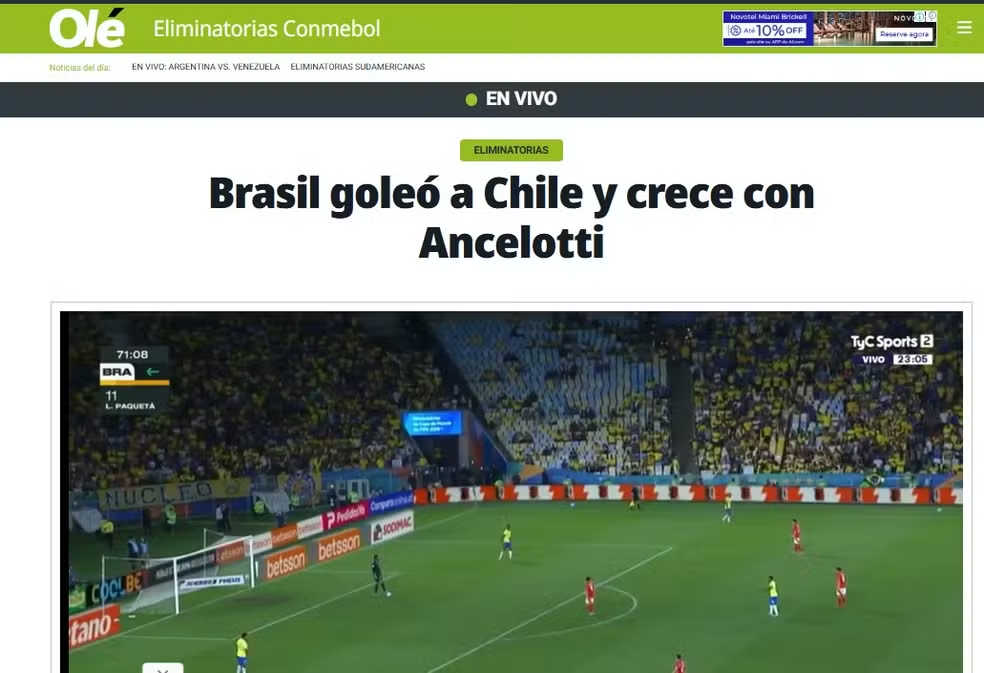 Jornais estrangeiros destacam trabalho de Ancelotti na Seleção: “Devolveu o sorriso ao Brasil” Diogo, 5 de Setembro, 20255 de Setembro, 2025 Mídia estrangeira elogia desempenho da equipe brasileira em vitória sobre o ChileA vitória imponente do Brasil sobre o Chile, por 3 a 0, nesta quinta-feira, pelas Eliminatórias, repercutiu na mídia estrangeira. Além do resultado, os jornais destacaram a evolução da seleção brasileira sob o comando do técnico Carlo Ancelotti. O jogo desta terça-feira foi o terceiro do técnico no comando da Seleção. Estreou com empate sem ogl com o Equador e, em seguida, teve uma vitória simples sobre o Paraguai, resultado que assegurou a vaga do Brasil para a próxima Copa do Mundo. Com o triunfo desta quinta, chegou à 28 pontos e alcançou o segundo lugar das Eliminatórias, atrás da Argentina. “Devolve o sorriso” Marca elogia atuação do Brasil contra o Chile — Foto: Reprodução: Marca O jornal espanhol Marca afirmou que Ancelotti devolveu o sorriso ao Brasil principalmente ao acertar na escolha da formação com quatro atacantes. Também destacou o desempenho individual dos homens de frente e a verticalidade da equipe. Porém fez ressalvas sobre os outros setores do time. “Cresce com Ancelotti” Olé aponta evolução do Brasil com Ancelotti — Foto: Reprodução: Diario Olé O jornal argentino “Olé” também destacou a escolha por quatro atacantes, em razão da ausência de nomes como Neymar, Vini Jr. e Rodrygo. O jornal vê Ancelotti devolvendo o prestígio ao “rival” e criando potencial de crescimento. O Diário As considerou a vitória sobre o Chile um dos melhores desempenhos recentes da seleção brasileira, e também entrou no coro de elogios ao técnico. Para o jornal, já é possível notar as marcas de Ancelotti na evolução do time. O Brasil volta a campo na próxima terça-feira para enfrentar a Bolívia, em La Paz, no último jogo das Eliminatórias da Copa de 2026. Leia Também: Tour Maracanã: descubra quanto custa, quando ir e o que ver por lá Esportes Futebol BrasilChile